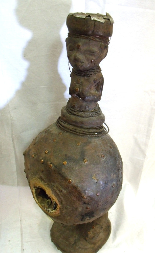 Mangbetu figure in which the human head is used to adorn an everyday object.this figure has a hole on the top which was used for smoking by king or notables.